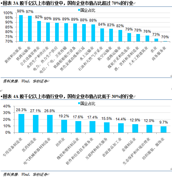快速侵入竞争性行业。在国民经济95个大类中,国有经济涉及94个行业;在396 个国民经济行业类别中,国有经济涉足380 个,行业布局达到96%。从A股上市公司行业结构看,千亿以上市值的行业中,新闻出版、铁路运输、公共设施、电力热力、电信广播、油气开采、运输、白酒、有色等行业的国有企业市值占行业总市值的比例都超过70%。