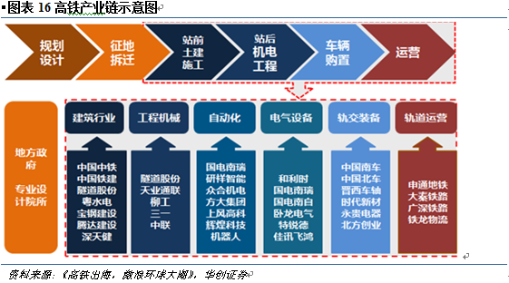 以轨道交通行业为例,目前中国参与或有意参与的国际项目总里程达到5448公里,投资额9364亿元。保守估计,未来10年全球新增里程1万公里,按照海外每公里建设成本2-3亿元,未来10年海外高铁市场容量2-3万亿。中国高铁出口具备多方优势,建设造价只有海外同行的1/3到1/2,具备丰富的国内建造和铁路出口经验,具备数倍出口、工程承包、系统标准等整体输出能力,以及后发技术集成优势。随着中国高铁出海,将带动从站前土建施工到轨道运营及相关零部件等多个行业,实现产业链整体“走出去”。(详见华创证券机械设备组全球高铁产业链专题报告之一《高铁出海,激浪环球大潮》)