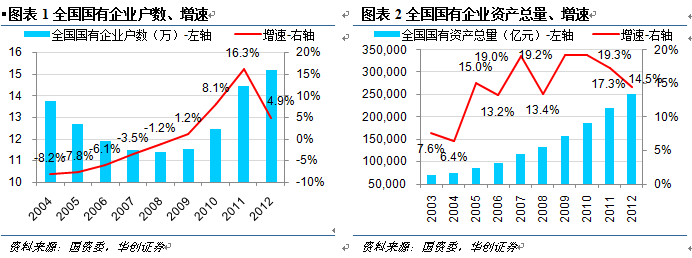 资产规模快速扩张。尽管经历过两轮国有企业改革,但国有资本独大的色彩依然浓厚,国有企业追求规模扩张的特征依然明显。国资委统计数据显示,2009-2012年全国国有企业户数年均复合增速9.7%,国有企业资产总量年均复合增速17.0%;其中,地方国有企业资产规模增速23.1%,远高于中央国有企业10.8%的资产规模增速。