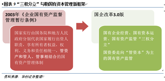 国有企业经营、国有资本运营、国有资产监管“三权分立”,改革国有资产的实现与管理形式将是国企改革3.0版的重中之重。在未来的国企改革顶层制度设计中,国资委有望退出全面“管人、管事、管资产”的国资监管模式,构建起“国资委-国有资本运营公司、国有资本投资公司-企业”的国资管理新架构。为配合国资分类运营、考核,国企将剥离、归并非核心业务,进一步明确企业定位。同时,将沿着“横向合并、纵向整合”的思路,以国企为依托,鼓励产业链条整体“走出去”。在这一过程中,资本市场无疑是资产定价和整合重组的最高效路径。