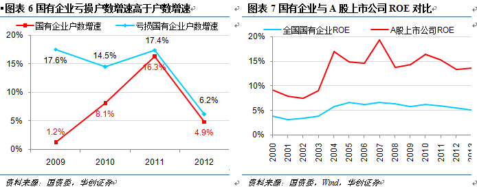 在国有资产高歌猛进的同时,国有企业经营效益却未见提高。金融危机后,亏损的国有企业数量从2009年的3.8万户增至2012年的5.4万户,年均增速12.6%,较同期国企总户数增速(9.7%)高出近3个百分点,显示国有企业尽管规模保持高速增长,但经营状况恶化。近年来,国有企业ROE与民营企业ROE的差距也不断拉大。2013年A股上市公司整体ROE水平13.6%,而国资委公布的全国国有企业ROE水平仅5.1%。