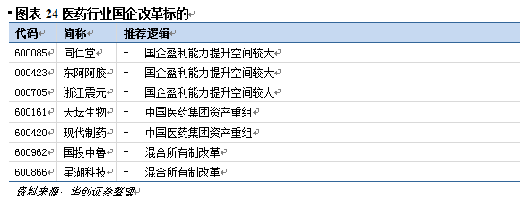 沿着三种思路筛选国企改革标的。从盈利能力提升空间上看,医药类国企经营质量低于民企,地方国企低于央企,体现为:(1)资产负债率,民企<地方国企<央企;(2)盈利能力,民企>央企>地方国企。国有企业的盈利能力提升空间较大,通过内部管理机制及激励机制的改善,相关企业有望重新焕发活力,推荐同仁堂、东阿阿胶、浙江震元。从资产重组角度看,14年7月15日,国资委公布中国医药集团总公司为6家四项改革试点企业之一,试点发展混合所有制经济、董事会行使高级管理人员选聘、业绩考核和薪酬管理职权改革。中国医药集团总公司旗下有6家上市公司,国药股份、国药一致、天坛生物、现代制药4家A股上市公司,以及国药控股、中国中药2家香港上市公司。从上市公司定位及股东体外资产角度来看,推荐天坛生物、现代制药。从混合所有制改革角度看,推荐国投中鲁及星湖科技。