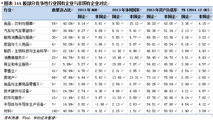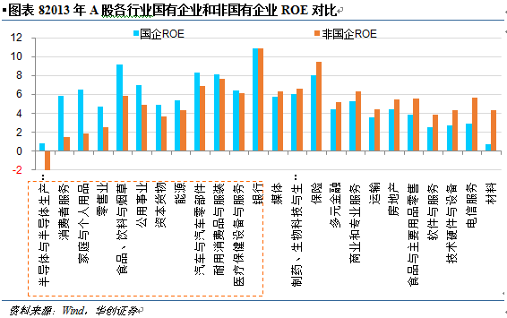 A股上市公司中,约一半行业国有企业ROE水平低于非国企ROE水平。以2013年年末上市公司ROE水平计算,Wind二级行业分类的24个行业中,12个行业的国企ROE水平低于非国企,其中材料、电信服务、技术硬件与设备、软件与服务、食品与主要用品零售、房地产等行业的国有企业ROE较非国企低20%以上。半导体与半导体生产设备、消费者服务、家庭与个人用品、零售业、食品、饮料与烟草、公用事业、资本货物、能源、汽车与汽车零部件、耐用消费品与服装、医疗保健设备与服务的国企盈利能力高于非国企。