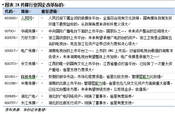 传媒行业国企分为三种层级,包括中央、省级和地方,这个和其他行业一样。传媒行业不一样的地方在于,其一,意识形态领域的产业,小产业、大政治,在现任领导层管理下,权力回收中央、加强管控的趋势明显,国家鼓励国有媒体创新、整合,抑制民营企业的无序竞争,政策环境更支持国有媒体,行业选股从产业市场化竞争的逻辑逐步过渡到意识形态领域,其中中央级别的媒体相对最受益,比如人民网、华闻传媒;其次是政治地位比较高、媒体影响力比较大的省份的国有媒体企业,比如电广传媒、万好万家、中文传媒、中南传媒、长江传媒、湖北广电等,最后是市场化程度比较高的地方媒体,博瑞传播、粤传媒等。其二,十八届三中全会,在所有行业中,单独提出文化产业“特殊管理股”制度,类似于金股制度,同股不同权,国有公司混合所有制的同时,考虑到文化企业是舆论口、党的喉舌,要保证政治属性,所以可以允许国有企业放开一部分股权给民营公司,但是绝不能放弃控制权,这是底线。“特殊管理股”提出一年,但是没有细则出台,估计要等到证券法的修改,预计2015年可以看到。特殊管理股解决文化产业混合所有制的问题,是比较特别的。