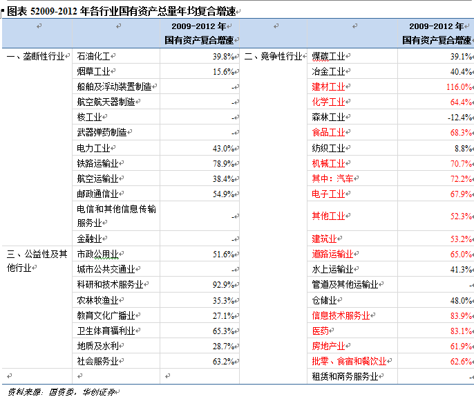 部分行业存在“国进民退”现象。从2009-2012年各行业国有资产年均复合增速看,在竞争性行业中的建材、化工、食品、机械、电子、建筑、道路运输、信息技术、医药、房地产、批零食宿和餐饮等行业,国有资产以年均50%以上的增速进入相应行业。由于国有企业在获得资源(土地、立项、贷款)方面有着天然的优势,对行业中的民营资本形成挤压。一方面,国企作为“软约束”主体,依靠获取廉价资源的优势,在市场经济的竞争中具有绝对的优势,对其它主体存在着较强的挤出效应,损害了市场经济的资源配置效率;另一方面,国企是生产要素“双轨制”的最大获利者,生产要素市场化的推动,不可避免的会遭遇国企的阻力。