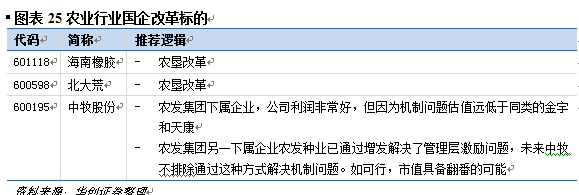 农业国有企业主要分为四个方面:国资委直属的央企(中粮集团六家视点央企之一,中国农业发展集团),农垦(海南橡胶、亚盛集团、st大荒)、兵团(天康生物、新农开发、新中基、西部牧业、冠农股份、新赛股份),地方国企(南宁糖业、罗牛山、敦煌种业)。其中农垦改革将是大方向。