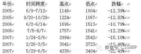 05年至07年的股权分置改革引发了那一波史无前例的大牛市,上证指数从05年6月6日的998点到07年10月16日的6124点,上涨513.63%。期间发生的回调如下表格所示: