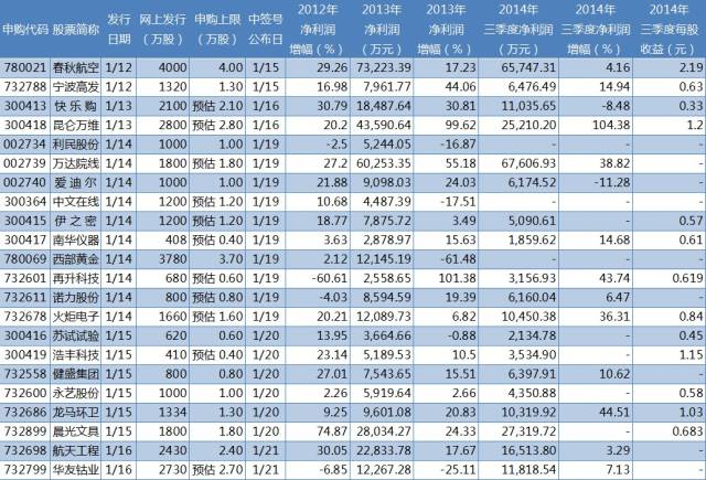 据统计,下周将要发行新股的22家公司中,有15家2012年和2013年业绩连续增长,其中11家2014年前三季净利润(8家未公布数据)继续增长。昆仑万维的业绩增幅最为抢眼,去年三季度增幅高达104.38%,2013年度增长99.62%,其次万达院线2014年前三季增长39%,2013年度净利润增幅达55%。就每股收益而言,下周一将申购的沪市新股春秋航空,虽然总股本高达三亿股,但去年前三季每股盈利达2.19元,其次昆仑万维、浩丰科技、龙马环卫三只每股收益也在1元以上。