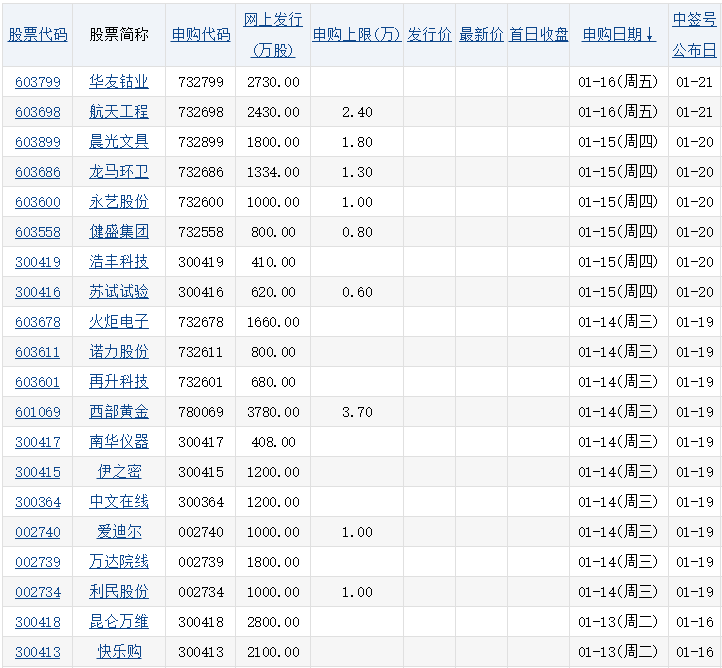 根据证监会的发行安排,1月5日核发的20只新股与推迟发行的春秋航空和宁波高发将于下周一开始紧锣密鼓地申购。在22只新股中,华友钴业、晨光文具等12只新股拟登陆上交所,快乐购、中文在线等7只在创业板上市,万达院线、利民股份、爱迪尔3只新股将登陆中小板。