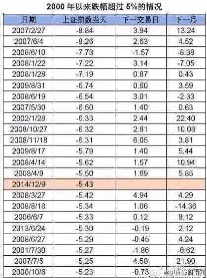 一张图透视沪指暴跌超过5%后第二天怎么走?给点信心,上次沪指14年12月19日暴跌5.43%后第二天反弹2.93%,之后一个月上涨15%。