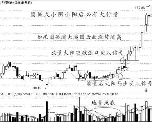 图解:平台式缩量休整小阴小阳时长为3-15天左右必会出现大阳;盘升式小阴小阳,特点是阳线微微带量,阴线要缩量,形成上移趋势,时长为15天以内;圆弧形中的缩量小阴小阳,时长15天以上。F4:挖坑埋牛