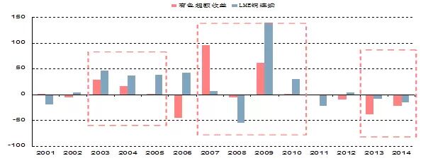 有色行业与LME铜价格涨跌幅正向关系大约是65%(14年中有9年是一致的),当然鉴于有色行业构成较煤炭复杂,其中稀土等细分行业,也难以用单一价格来描述。