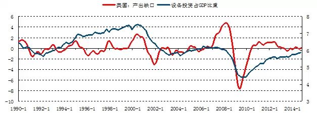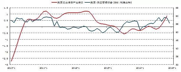 2010年3季度以来,美国工业生产环比小幅波动,产出缺口虽然没有明显扩张趋势,但基本运行在潜在水平之上,并没有显著下行,其制造业PMI则自2014年初以来显著反弹,并一直运行在扩张区间。