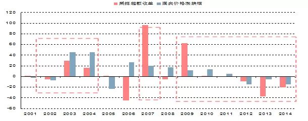 2001年以来,煤炭行业的超额收益与价格关系非常密切:14年间有10年是一致的,即煤炭行业超额收益70%以上与煤炭价格呈正向关系,其余4年,即便背离,也不算太离谱。