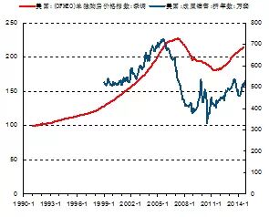 哈里森在《The Power in the Land 》和《Boombust : House prices and thedepression of 2010》中认为:(1)房地产的周期是18 年左右;(2)当前18 年的房地产周期依然在起作用。(3)哈里森的模型表明:房价会先上涨7 年,然后可能会出现一个短期的回调,再经历5 年左右的快速上涨,之后是2 年最后的疯狂,最后是历时4 年左右的崩溃。即典型的地产周期中,前14年房价都是上涨的,后四年房价下跌。