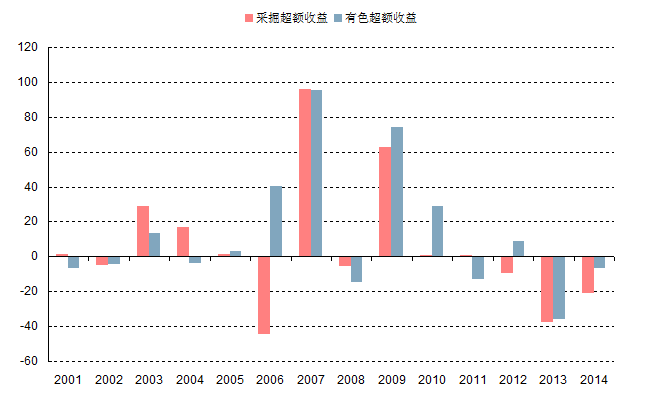 2011年以来,采掘指数连续三年跑输全A指数,录得负超额收益,超额收益分别为-9.4%、-37.5%、-20.8%;有色行业也连续两年跑输全A指数,分别为-35.9%、-6.5%。