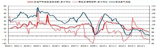 2012年以来短周期运行一波三折,本轮短周期运行与以往不同之处,运行于中周期下行阶段(中周期于2011年6月下行),短周期运行于加库存与基建投资支撑之下,房地产投资贡献不大。尤其是2013年11月以来,随着地产投资、销售的下行,基建投资也难以支撑像样的反弹(2014年5-7月短周期小反弹)。