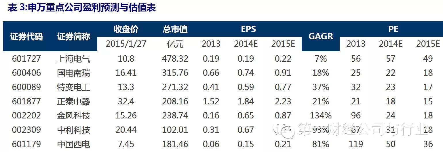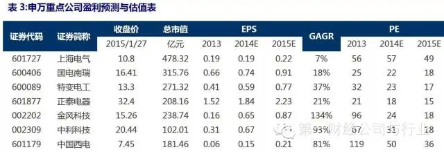我们判断随着油价的走稳和2015 年政策目标的明确,光伏板块有望迎来从容布局时机,早期应关注业绩稳定性强、估值水平低的白马股,建议关注隆基股份(15PE27x)、森源电气(15PE 22x)、中利科技(15PE 18x)、爱康科技(15PE 22x)、阳光电源(15PE 23x)、华北高速(15PE 15x)、首航节能(15PE 22x)、林洋电子(15PE 17x)、特变电工(15PE 17x)、易事特(15PE 28x)、航天机电(15PE 24x)。