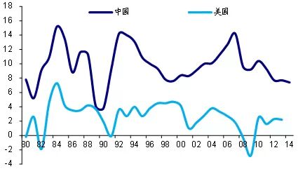 图16:美国GDP增速远低于中国(%)