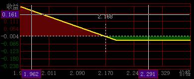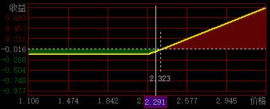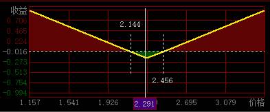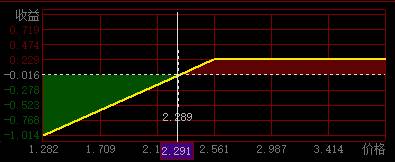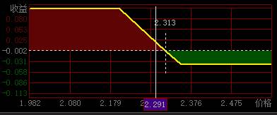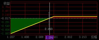 此策略可以净收取1128.00元的权利金,盈亏平衡点为2.313,即是说当市场在到期日价格低于2.313时即可获得正收益,但当市场价格高于2.313时则为负收益。
