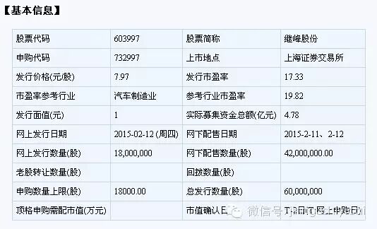 继峰股份此次发行总数为6000万股,网上发行1800万股,发行市盈率17.33倍,申购代码:732997,申购价格:7.97元,单一帐户申购上限18000股,申购数量1000股整数倍