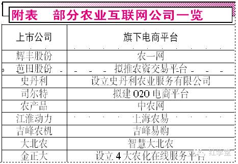 从目前的A股上市公司来看,很多农业产业链上的企业已经具备互联网基因和潜质,并且拥有优秀产品和庞大的销售网络。主流农资企业纷纷展开电商业务,互联网模式受企业热捧。从A股上市公司来看,辉丰股份等农资上市公司相继成立电商子公司。具体来看,辉丰股份旗下农一网进展顺利,11月上线以来电商业务的开展远超预期。农产品作为中国最大的线下实体农批市场运营商,近年积极打造全渠道、全品类、多层次的农产品电子商务体系,通过“中农网”布局大宗农产品的B2B与B2C平台业务;神舟信息收购中农信达,进军智慧农村。
