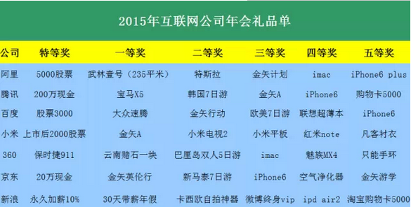 今年的互联网公司年会奖励被网友总结会,公布了出来: