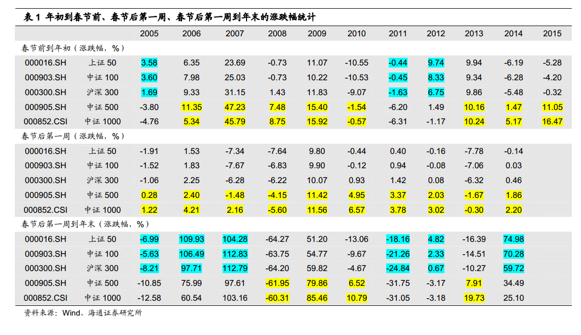 聚焦春节:我们统计了2005年以来到2014年共10年的春节前后股市表现,以上证50、中证100、沪深300代表大盘股,以中证500、中证1000代表小盘股,来比较大小盘股在年初到春节前、春节后第一周、春节后第一周到年末这三个阶段的表现。