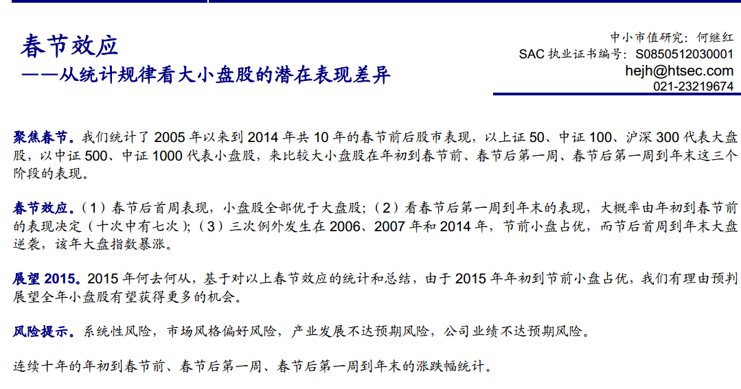 展望2015:2015年何去何从,基于对以上春节效应的统计和总结,由于2015年年初到节前小盘占优,我们有理由预判展望全年小盘股有望获得更多的机会。