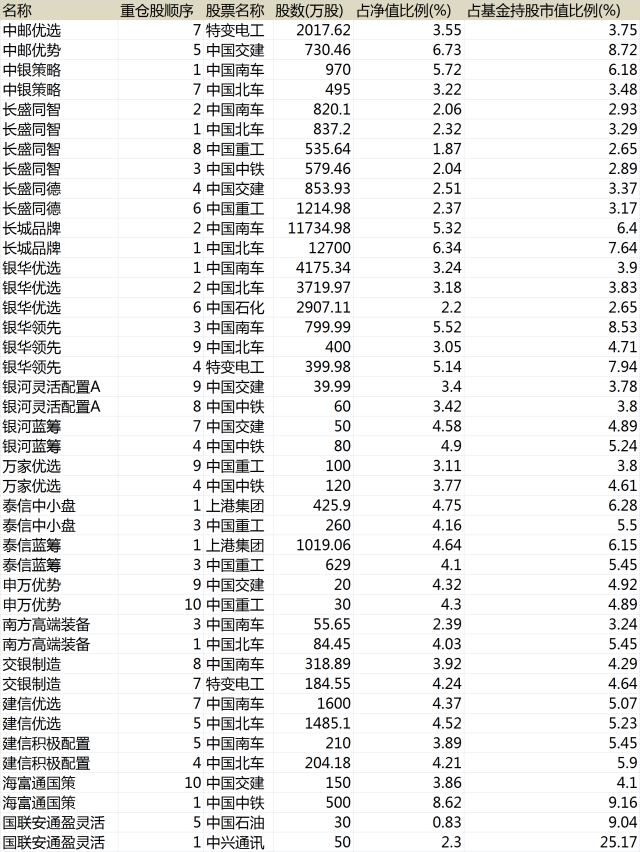 其中有19只基金前十大重仓股中布局了其中两只或者两只以上,需要引起重视,尤其是长盛同智,布局了中国南车(12.12,-0.10,-0.82%)、中国北车(12.84,-0.14,-1.08%)、中国重工(8.96,0.00,0.00%)、中国中铁(8.58,-0.06,-0.69%)等。另外,南方小康指数重点投资先进制造业、现代服务业和基础产业的蓝筹股,即现在的一带一路涉及的核心标的,也值得关注。