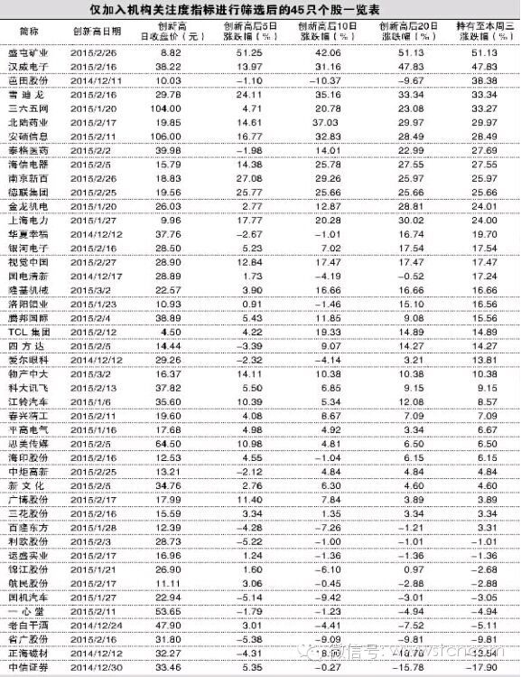 那么加入评级上调这一条件后的实际测算结果如何呢?数据显示,按照下列步骤:1、建立个股的机构关注度数据库,筛选出机构关注度上升的个股;2、密切关注这些个股能否创历史新高;3、如创新高日股价未涨停,则以收盘价买入。共选出45只个股,买入5、10、20个交易日后,平均每只个股的收益率分别为6.54%、8.62%和11.01%,实现正收益的概率依次为73.33%、62.22%和73.33%。如果一直持有至本周三,收益率为13.18%,实现正收益的个股比例达到77.78%。