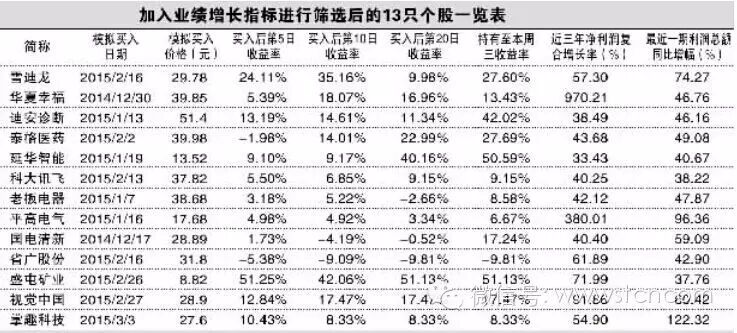 ●筛选后个股股价稳定性更高:经过两次筛选,我们得到的成长组合的个股数量大幅减少,但收益率水平却明显提升。从两组数据持股10日和20日的表现来看,45只个股的组合不仅收益率逊色很多,单只个股的最大亏损比例也高达18%以上,而13只个股的组合,单只个股的最大亏损比例不到10%。如果一直持有至本周三,后者的整体收益更是高达20.78%。这显示出经过业绩增长率筛选后的个股,股价的稳定性相对更高,上涨动力更为持久。