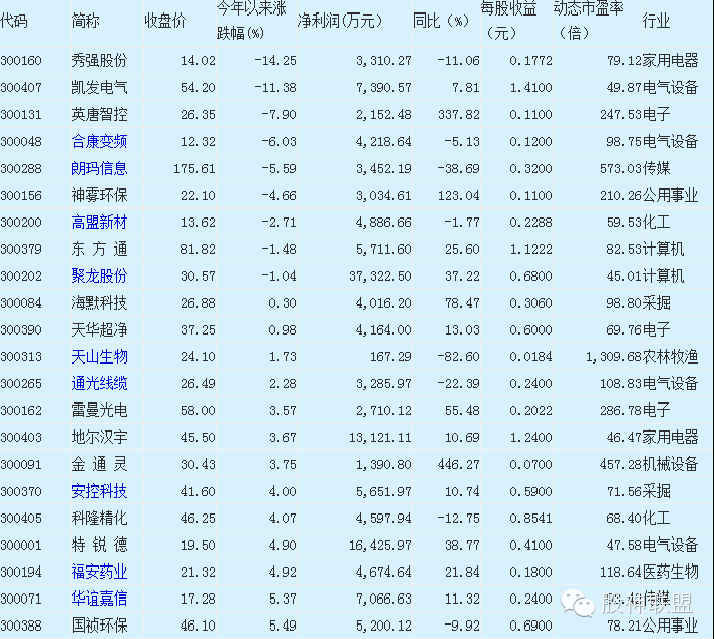 23只滞涨创业板个股中,有3家公司去年净利润同比增幅翻番。业绩增幅最大的金通灵,去年实现净利润1390.80万元,同比增长446.27%,年内涨幅仅3.75%。紧随其后的英唐智控,净利润同比增长337.82%,今年以来下跌7.9%。神雾环保位居第三,净利润同比增长123.04%,年内下跌4.66%。此外,海默科技、雷曼光电净利润同比增幅超过50%,年内分别上涨0.3%、3.57%。