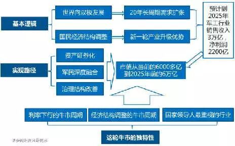 "资产证券化+军民深度融合+国企改革"共同驱劢下,我们预计2025年我国国防工业整体利润将突破2000亿元,届时军工总市值有望达到6万亿,相当于目前的十倍!
