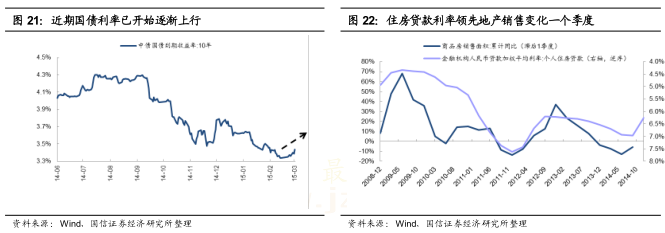 而从投资时钟的角度来说,目前的环境出现了一些变化。2014 年属于典型的投资时钟第一象限,即地产销售逐渐企稳而利率不断下行,对应的是大盘蓝筹股的修复行情。但近期情况则与传统周期有所差异,过去周期中高利率才会抑制地产销售,但进入 2015 年,在利率并未提升的情况下地产销售同比增速大幅回落。这使得市场放大了对于传统行业的担心,因此在利率仍然下行的情况下,对传统行业的担忧使得市场直接进入了小盘股模式。传统的周期节奏有所变化。
