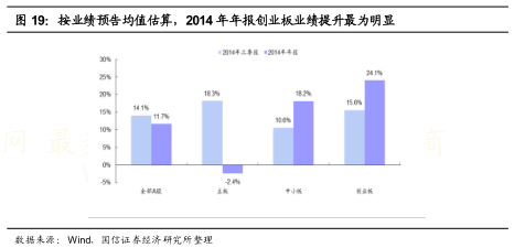 业绩:创业板年报提升最为明显,短期关注一季报业绩预告密集披露近期将进入年报和季报的密集披露期。在我们的前期业绩分析报告中我们也提到,我们预计 2014 年年报非金融上市公司业绩增速将由三季报的 8.5%回落至6.3%。但结构上来看,虽然主板公司业绩下滑严重,但中小板和创业板公司业绩增速提升明显,分别由三季报的 10.6%和 15.6%提升至18.2%和 24.1%。整体上中小板和创业板的盈利趋势要明显好于主板。因此业绩趋势上也支撑当前的小盘股行情。具体可以参考我们前期的报告《关注中游和创业板白马——2014 年年报前瞻》。未来 3 月下半旬进入创业板一季报预告密集期,须关注业绩真实增长,我们也会继续对公司业绩情况进行跟踪报告。