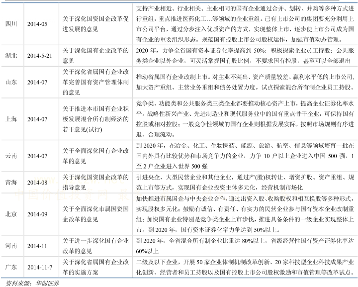 2)管理机制要变:管资产管人管事相分离,引入市场化经营管理机制。从省级层面看,除了国有资本投向要进行结构化调整,资产证券化程度也成为改革指标。这意味着借助上市公司平台进行国有资产重组将成为国企改革主题之一。