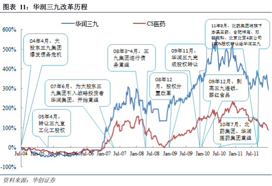 华润三九前大股东三九集团于 04 年爆发债务危机,07 年 6 月引入战略投资者华润(集团)有限公司,正式开始重组及改革,09 年 11 月完成重组,10 年 7 月,华润医药集团(华润三九控股股东华润医药控股系其全资子公司)与北药集团重组,11 年 9 月,北药集团将旗下本溪三药、合肥神鹿、双鹤高科、北京北贸 4 家公司 100%股权转让给华润三九。