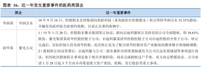 我们对 57 家涉及国企背景的医药类上市公司近一年以来的重要相关事项及公告进行了统计分析,预计继国药系、太极系、哈药系之后,清华系、上海交大系、英特集团、浙江震元、华北制药、广济药业、精华制药有可能在近期陆续启动或延续国企改革。