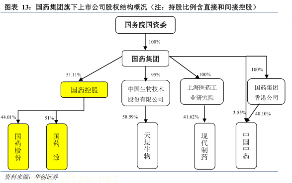 国药集团旗下有 6 家上市公司,国药股份、国药一致、天坛生物、现代制药 4 家 A股上市公司,以及国药控股、中国中药 2 家香港上市公司。