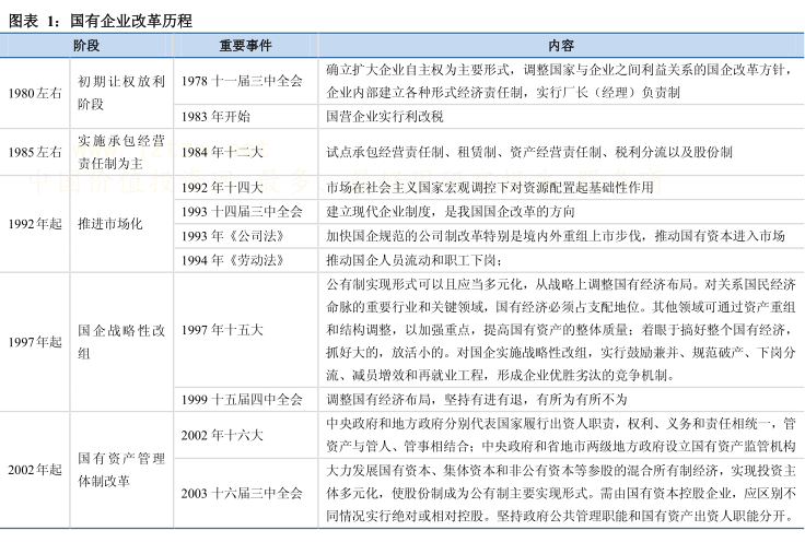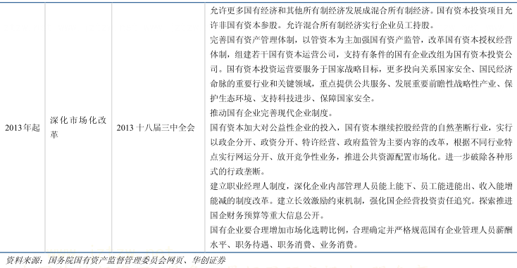 自 1978 年改革开放以来,国企改革先后经历:上世纪 90 年代中小国企私有化、21 世纪初混改并由国资委充当管理主体。2013 年 10 月的三中全会则确立了“选择性混改进而引导国有资本投向”和“管资产管人管事相分离,引入市场化经营管理机制”的基调。具体而言,新一轮国企改革的特点有: