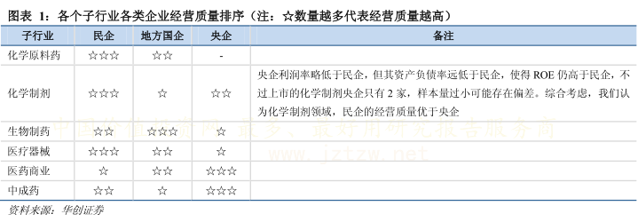 1)化学原料药和化学制剂行业属于竞争较为充分行业,目前民企经营质量高于国企,且民企中出现华海药业、恒瑞医药等具有国际竞争力的企业,未来国企退出的预期或将强化;