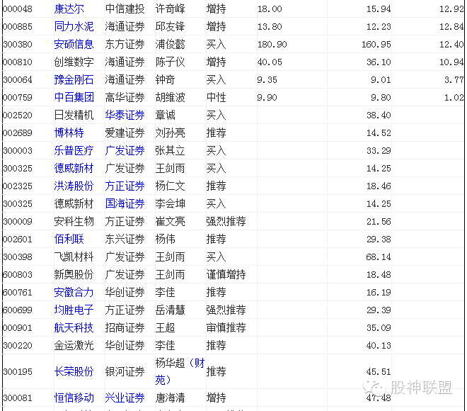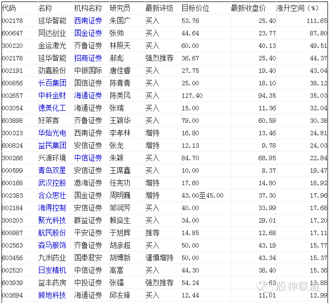 据证券时报数据中心统计,近5日65只个股首次获得机构关注。其中,延华智能、益丰药房、安科生物等7只个股获得强烈推荐。涨升空间最大的延华智能,目标涨幅高达111.65%。同达创业紧随其后,目标涨幅87.8%。金运激光、延华智能、劲嘉股份目标涨幅超40%。