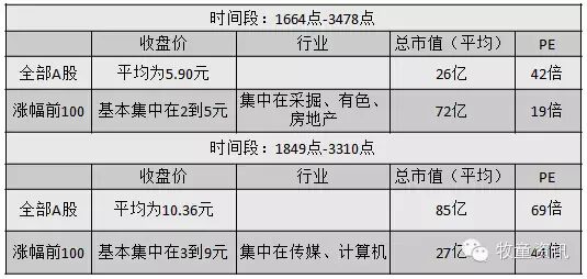 那么牛市中牛股都具备怎样的共性?小编通过统计1664点-3478点及1849点-3310点两次反弹中,A股涨幅前100股票的开始反弹初期的股价、市值、所属行业、市值、PE,看看能否得出一些对投资者的有用的资讯。