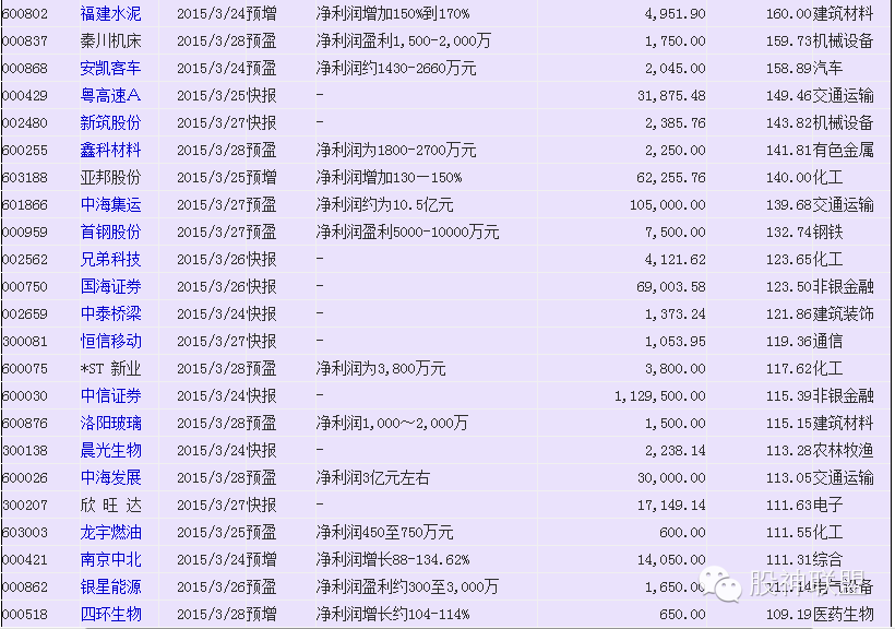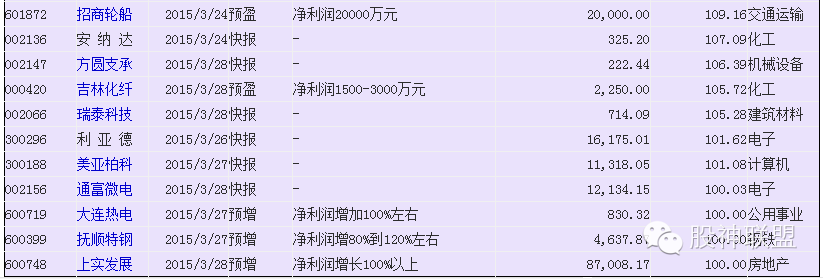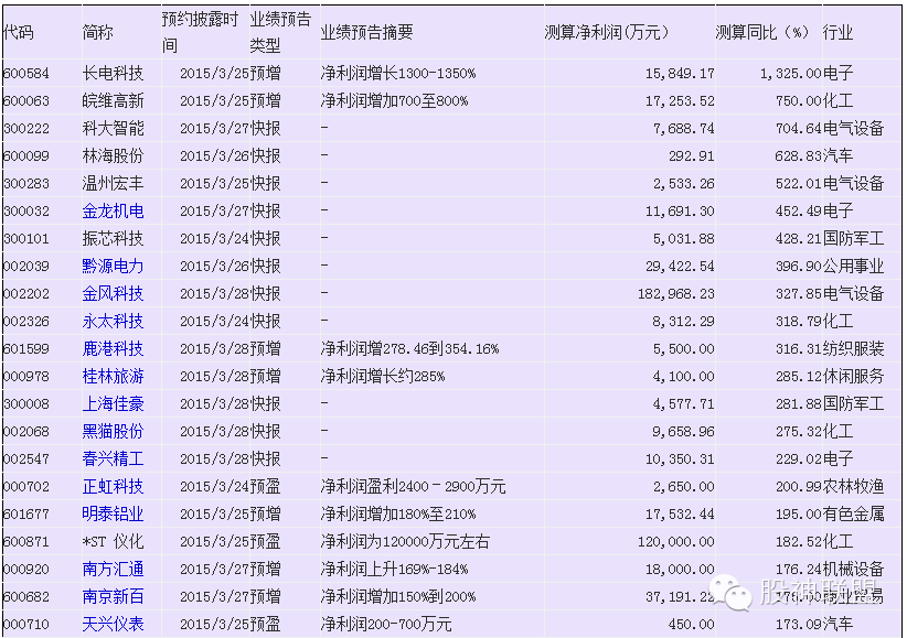 业绩增幅最大的长电科技,预计去年净利润同比增幅高达1300-1350%,2014年度移动智能终端市场需求较旺盛,公司集成电路封测产能利用率提高,高端产品增长较快,公司盈利能力逐步恢复。紧随其后的皖维高新,预计净利润增长700至800%。这两家业绩公司都将在下周三披露年报。此外,科大智能、林海股份、温州宏丰业绩快报数据显示,净利润同比增幅超500%。