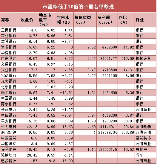 导读:投资大师格雷厄姆曾提出最神奇的选股指标:市盈率低于10倍。在上证指数气势如虹冲上3700点后,10倍以下市盈率个股已成稀缺资源。据证券时报数据中心统计,截至今日收盘,深沪两市动态市盈率低于10倍的公司仅剩24家。估值最低的农业银行,动态市盈率5.82倍。24家市盈率低于10倍的个股中,有15家为银行股,占比逾六成,3只来自公共事业。