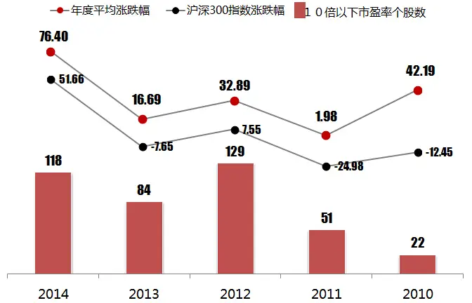 格雷厄姆所谓的低市盈率选股方法,也许让很多人质疑。我们用格雷厄姆的选股方法对过去5年A股市场进行检验,结果出人意料。在每年的1月1日选择当时动态市盈率低于10倍的个股,并统计这些个股当年度的平均涨幅,结果如下:2010年1月1日,动态市盈率低于10倍的个股共有22只,当年平均年涨幅高达42.19%,同年沪深300指数下跌12.45%。2011年至2014年情况请见下图,近5年市盈率在10倍以下的个股年度平均涨幅均远超沪深300指数。