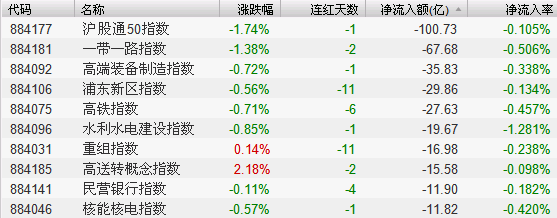 1.沪股通50、一带一路和高端装备制造板块表现低迷,资金流出较为显著。