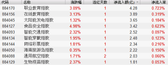 1.概念板块方面,职业教育、在线教育和食品安全等板块涨幅居前,资金流入较为显著。