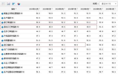 值得注意的是,虽然制造业PMI预期连续28月位于荣枯线上方,但其构成指数中比重最大的新订单指数已连续5个月回落,其中反映外部需求变化的新出口订单指数连续5个月低于50%,10月份数据已低于47%,表明下降率加快。同时,进口指数连降5个月,其中4个月低于50%。 (中新经纬APP)